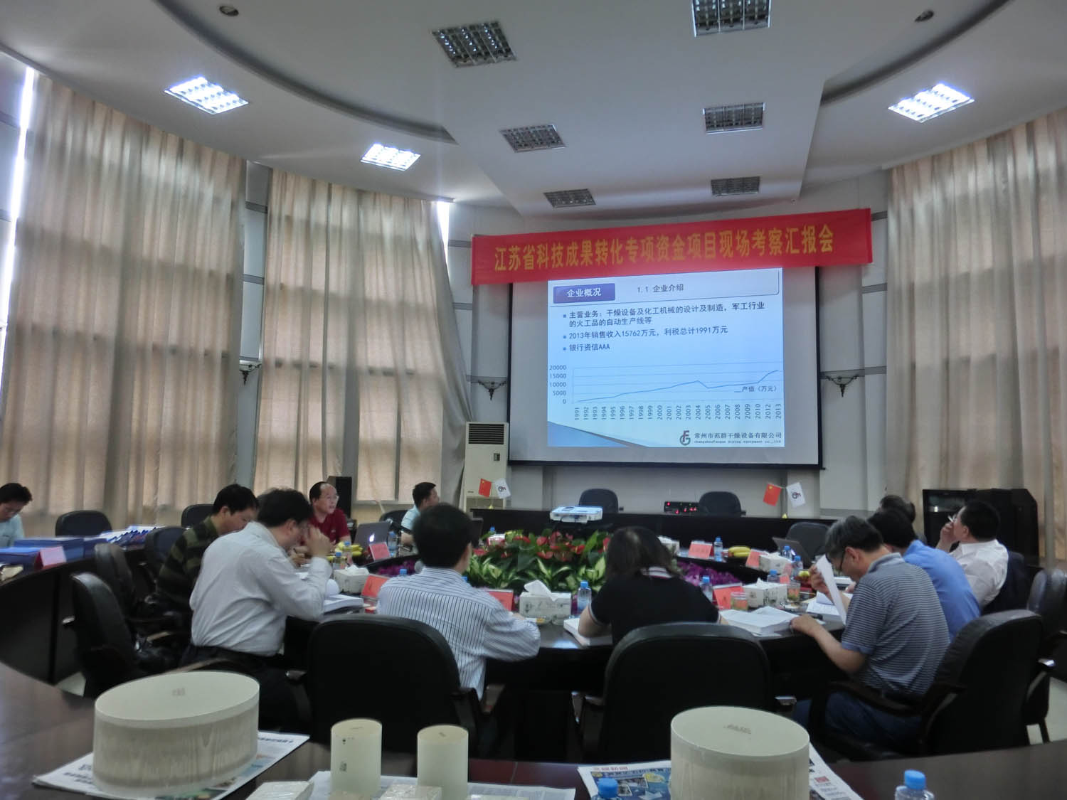5月22日上午,由江蘇省科技廳、常州市科技局、新北區科技局領導和專家組成的專家組來到我公司,在我公司會議室召開了“江蘇省科技成果轉化專項資金項目現場考察匯報會”,會上公司董事長范炳洪先生作了專題匯報,并重點介紹了這次申報項目的具體情況,陪同領導和專家實地察看了公司研發中心、實驗室、生產車間等;各位專家詳細聽取了匯報,并認真了解申報項目中的產品生產和運行情況,詢問有關項目產品的一些問題。專家組成員肯定了我公司的資料準備充分,所報項目也得到專家的一致認可。